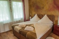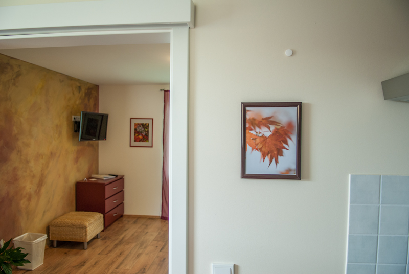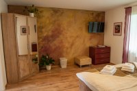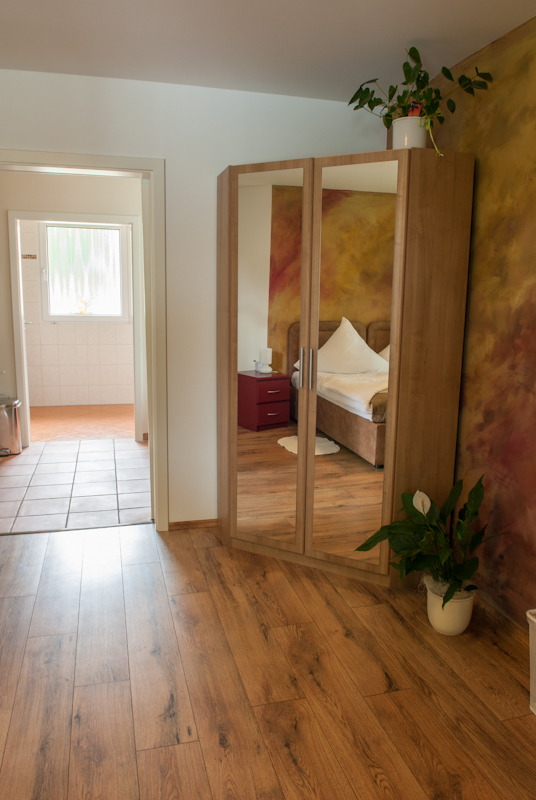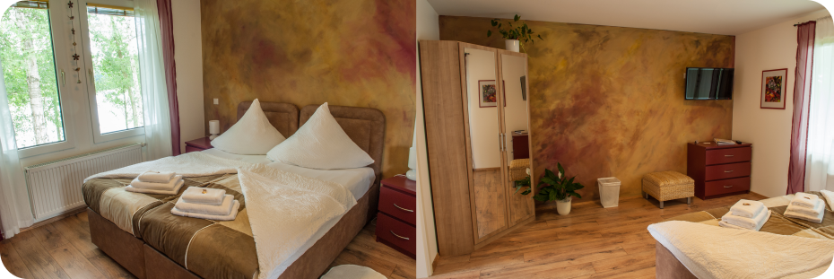 Ein Gefühl vom Indian Summer können Sie im gleichnamigen Zimmer bekommen. Mit den kunstvoll gestalteten Wänden und den dazu passenden Möbeln wurde die Laubfärbung der Bäume im Herbst nachempfunden. Vom Wohn-/Schlafraum (17,5 m²) aus haben Sie direkte Sicht auf den Chossewitzer See.