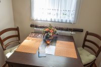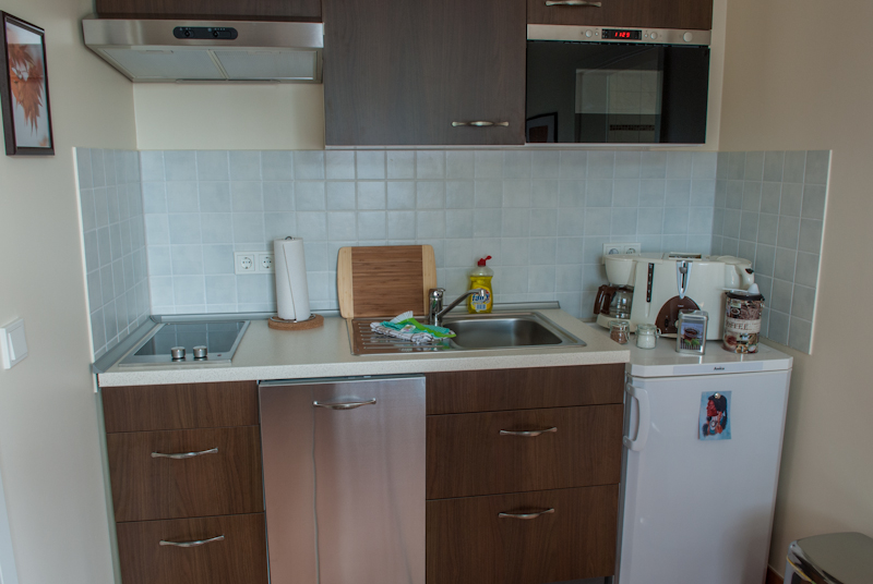 Diese, unsere kleinste, Ferienwohnung bietet Platz für 2 Personen. Die 7,5 m² große Küche ist vom Wohnraum separiert und bietet Geschirrspüler, Kochfeld, Mikrowelle, Kaffeemaschine, Toaster, Teeoase sowie Sitzgelegenheit.