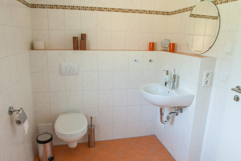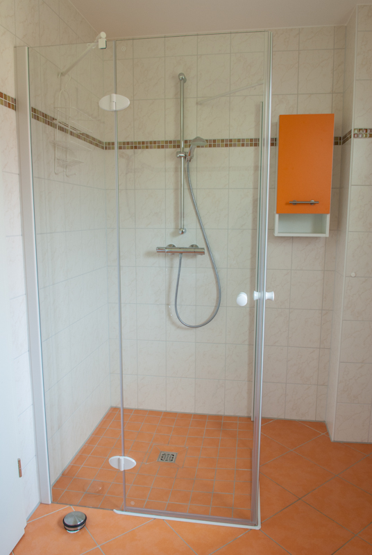 Das Bad ist mit seinen 6,5 m² sehr geräumig. Die Dusche ist ebenerdig.