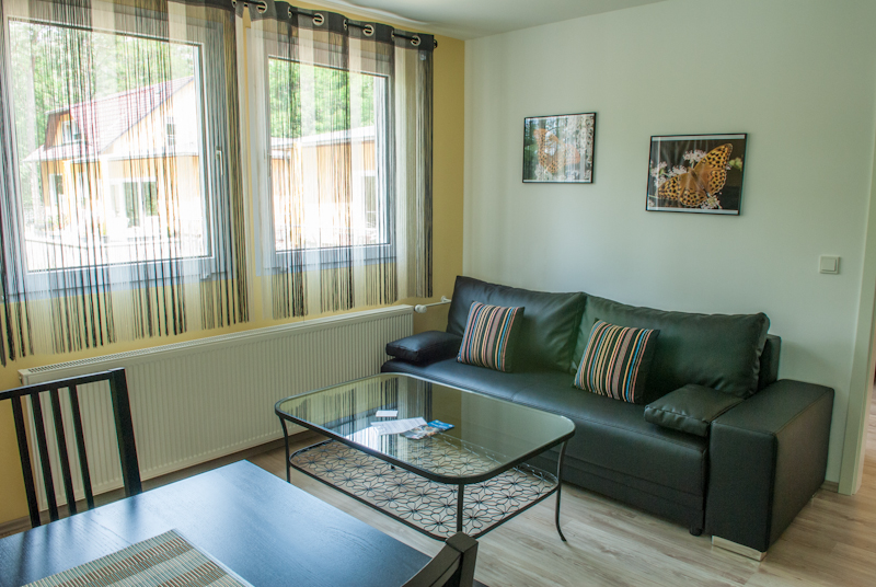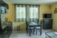 Von allen Fenstern dieser Wohnung sehen Sie auf den Chossewitzer See. Das Wohnzimmer (19,3 m²) mit vollausgestatteter Küchenzeile, Ess- und TV-Bereich lädt zum gemütlichen Verweilen ein.