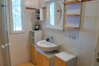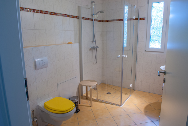 Das Badezimmer (6,3 m²) verfügt über eine ebenerdige Dusche, genügend Stauraum, Fön, Kosmetikspiegel und Zahnputzbecher.