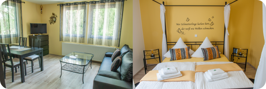 Ein Highlight ist das 15 m² große, kuschelige Schlafzimmer mit romantischem Himmelbett.