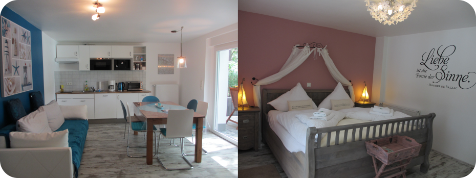 Diese, unsere größte Ferienwohnung, besteht aus einem Wohnzimmer mit vollausgestatteter Küche, Ess- und TV-Bereich; 2 romantischen Schlafzimmern und einem Wellnessbad mit Sauna.